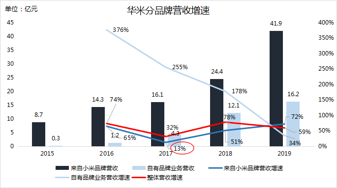 2019年,華米Amazfit出貨量與自有品牌業(yè)務(wù)營(yíng)收增速分別為26%與34%,相較2018年大幅放緩,也不及來(lái)自小米品牌的出貨量、營(yíng)收增速。