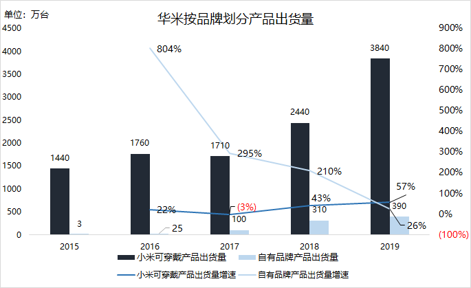 在招股書及年報(bào)中,華米會(huì)將營(yíng)收按品牌來(lái)源劃分為來(lái)自小米品牌與來(lái)自自有品牌業(yè)務(wù)兩部分。