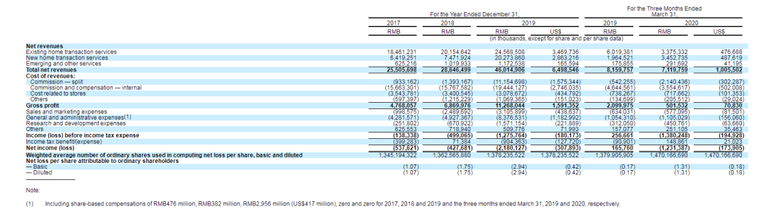 隨之而來的是年營收突發猛進。招股書顯示,貝殼找房2018年、2019年、2020年一季度營收分別為286.46億元、460億元、71.2億元。收入主要來自住房交易和服務的傭金,其中2019年二手房交易和新房交易收入分別為246億元人民幣和202億元人民幣。不過,貝殼尚未盈利,同期凈虧損分別為4.27億元、21.8億元和12.31億元。