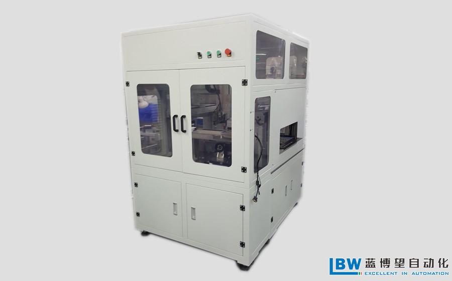 該設(shè)備為在線式點膠機,產(chǎn)品或由專用的產(chǎn)品工裝從設(shè)備的側(cè)方左進右出或右進左出,傳送到設(shè)備內(nèi)部并對產(chǎn)品進行簡單的定位夾緊,使產(chǎn)品具有相對一致的位置,然后利用位于機械手頭部的相機組件對產(chǎn)品上的Mark點進行拍照定位。定位完成后設(shè)備開始到事先程序建立的位置進行點膠,點膠完成后,松開產(chǎn)品,產(chǎn)品或帶工裝的產(chǎn)品經(jīng)由設(shè)備內(nèi)的鏈板線自動流至下一個工位。